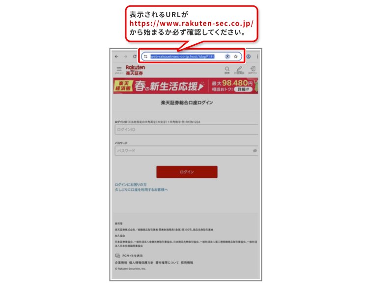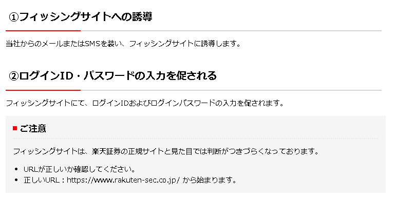 リアルタイムフィッシングの手口について、順を追って説明していきます。楽天証券の注意喚起がわかりやすかったので、楽天証券の場合を例として説明しようと思います。