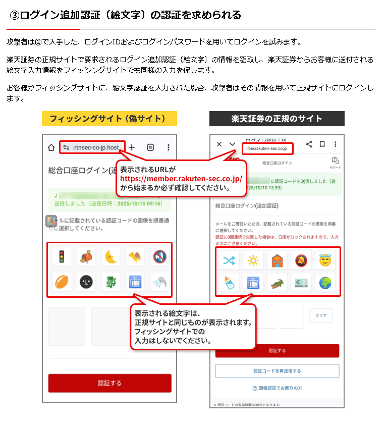 基本的には今までのフィッシングと似た流れとなりますが、リアルタイムフィッシングでは二段階認証(楽天証券の場合は絵文字による認証)を突破するために行われている詐欺行為となっています。二段階認証が必須となる前は、ログインIDとPWが割れてしまえば詐欺を働く不届き者は即ログインできていましたが、現状では二段階認証を間に挟んでいるため、この認証を突破するためにフィッシングサイトにも同じ絵文字を表示させて選択させようとしてきます。