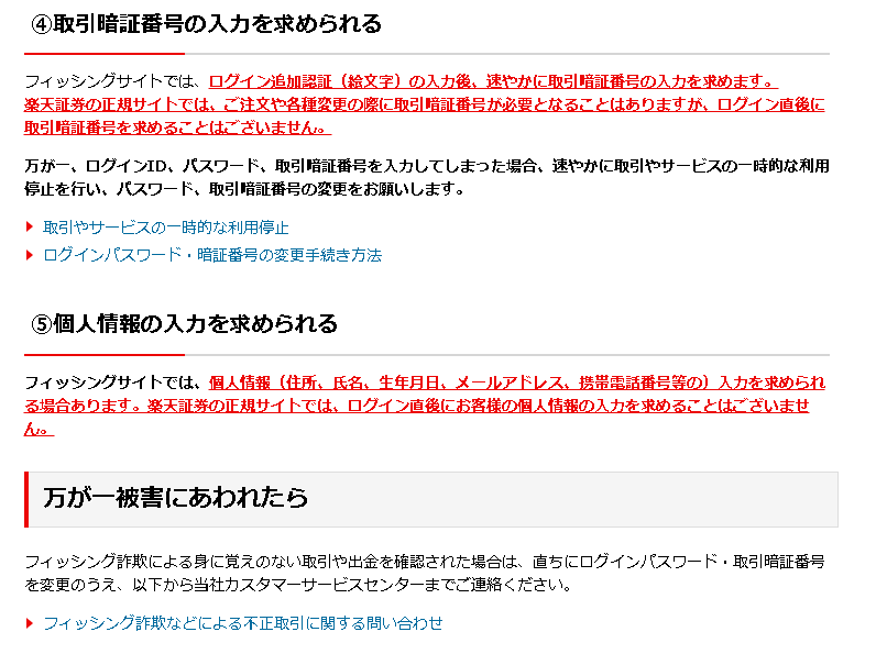 フィッシングサイトを正規サイトだと誤認している場合は二段階認証までは入力してしまう可能性がありますが、その後の④と⑤、取引暗証番号と個人情報をログイン直後に入力させてくるのはおかしいと思ったほうがいいです。不正取引を防ぐための最後の砦となってくるこの2つの情報は入れてしまったら最後、不届き者は超速で取引を開始、金融資産は根こそぎ被害を受けてしまいますので、絶対にこの2つだけはフィッシングサイトで入力しないでください。