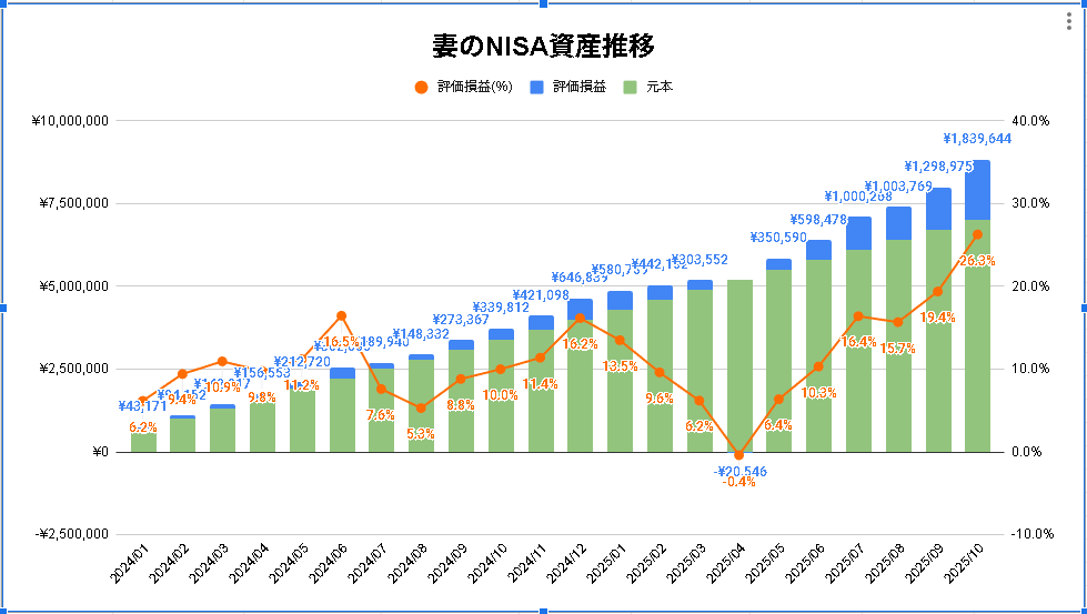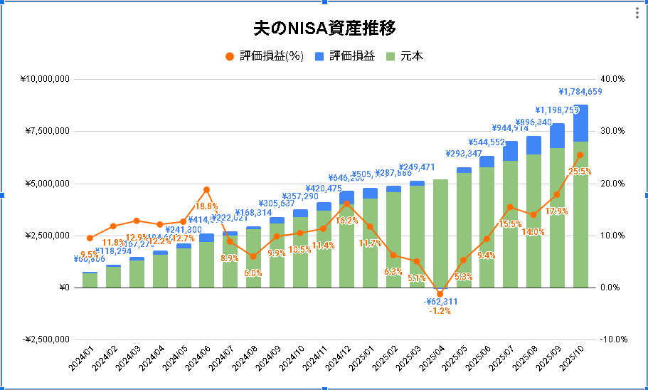 我が家のNISA資産は元本700万円に対して、約180万円の評価損益、26%程度の評価損益率となりました。この1ヶ月だけを見ても、60万円前後も含み益が増えました。米中発の関税バトルにも負けず市場に残り続けた方は、ここ数ヶ月は上昇という名のボーナスタイムを享受できたかと思います。