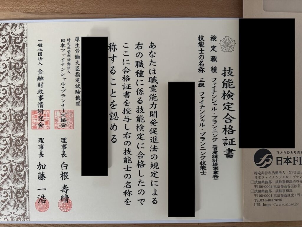 個人情報に繋がる部分は黒塗りとしていますので、ご了承ください。試験終了後すぐに簡易結果がわかるのですが、ボーダーラインぎりぎりでの合格でしたのでめっちゃ焦りました。ただ、ぎりぎりでも合格には変わりありませんので、これで一応FP3級保持を名乗ることができるようになりました。2級に関しては今のところ受けるつもりはありませんが、気が向いたら取得に動くかもしれません。3級取得についても技能士として何かしたいというわけではなく、あくまで金融に関する知識を身につけるために勉強をして、形として残すために受験をしました。このブログの記事においても、ただの一般人の戯言から「FP3級の戯言」にレベルアップできましたので、以前よりは説得力があるものに進化できたと思います。
