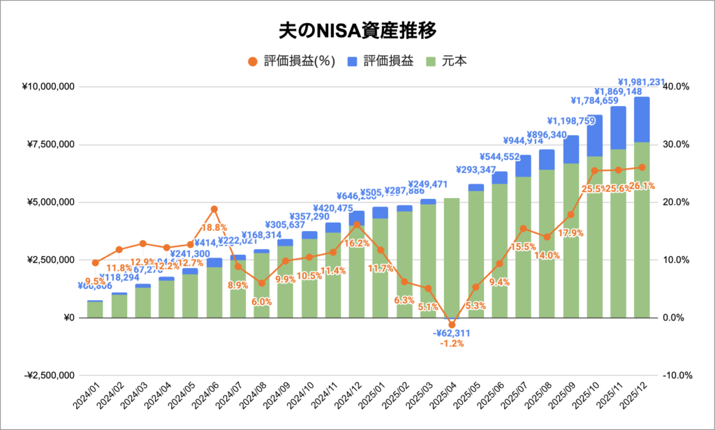 そんな当ブログの新年一発目の記事は、昨年末のNISA資産推移を公開したいと思います。年末に記事を上げれたらよかったのですが、年末は色々と忙しかったことと、今年の正月は出勤で社畜と化していたため、このタイミングでの記事投稿となってしまいました。正月休みという感覚が全く湧かない私ですが、2025年のまとめの意味も込めて、我が家のNISA資産推移を確認していきたいと思います。
