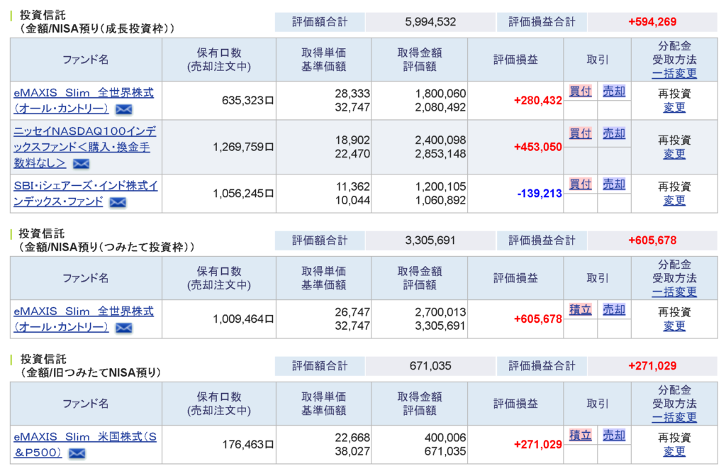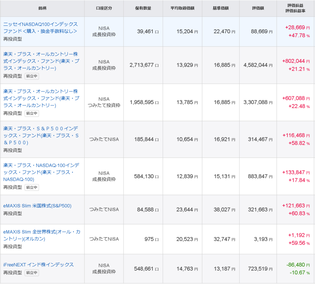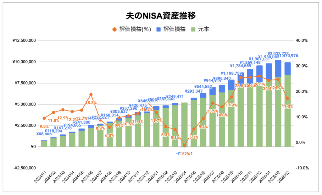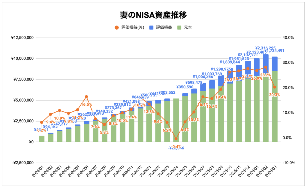 2026年3月における評価損益は、私が約150万円の17.3%、妻が約170万円の20.3%となりました。前月と比べると、大体50〜60万円程度のマイナス、率だと7〜8%のマイナスとなりました。冒頭お話しました戦争の影響で相場は乱高下、下落が優勢となっているため結構なマイナスを喰らいましたが、円安が進んだためマイナス幅は少し軽減されています。