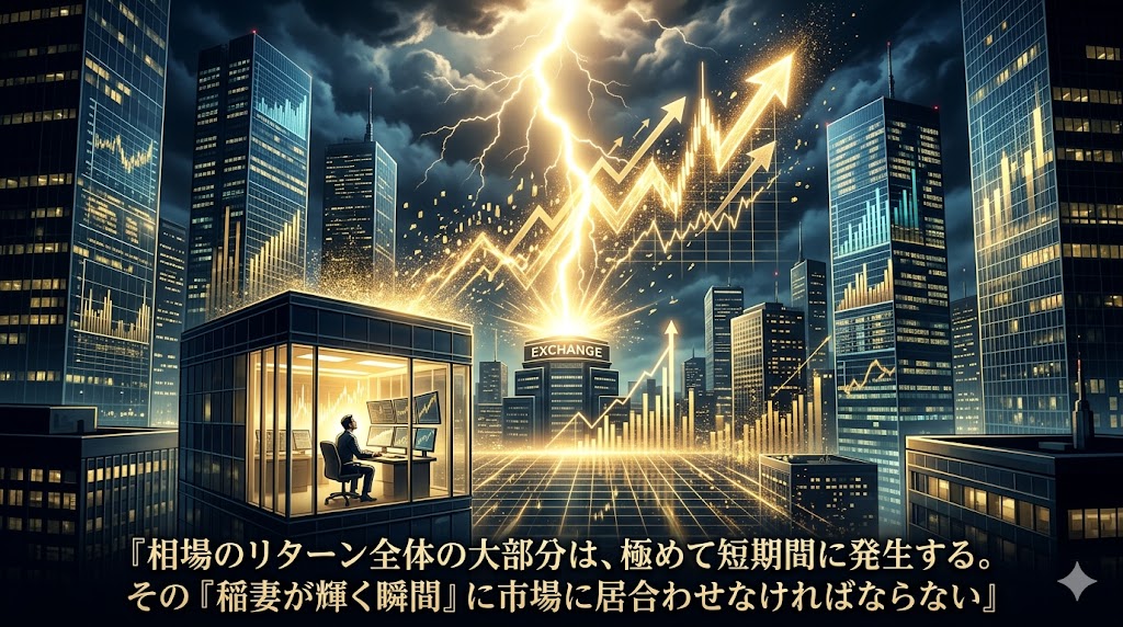 「相場のリターン全体の大部分は、極めて短期間に発生する。その『稲妻が輝く瞬間』に市場に居合わせなければならない」